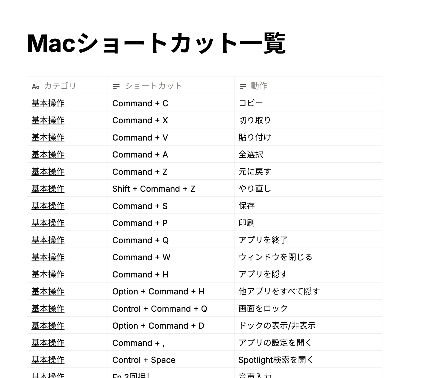 Macの操作を効率化する、実用ショートカットをカテゴリ別にまとめた一覧です。